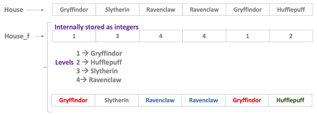 levels(HarryPotter$house_f) ##prueba con «levels(HarryPotter$house)» y observa la diferencia[1] "Gryffindor" "Hufflepuff" "Ravenclaw" "Slytherin"