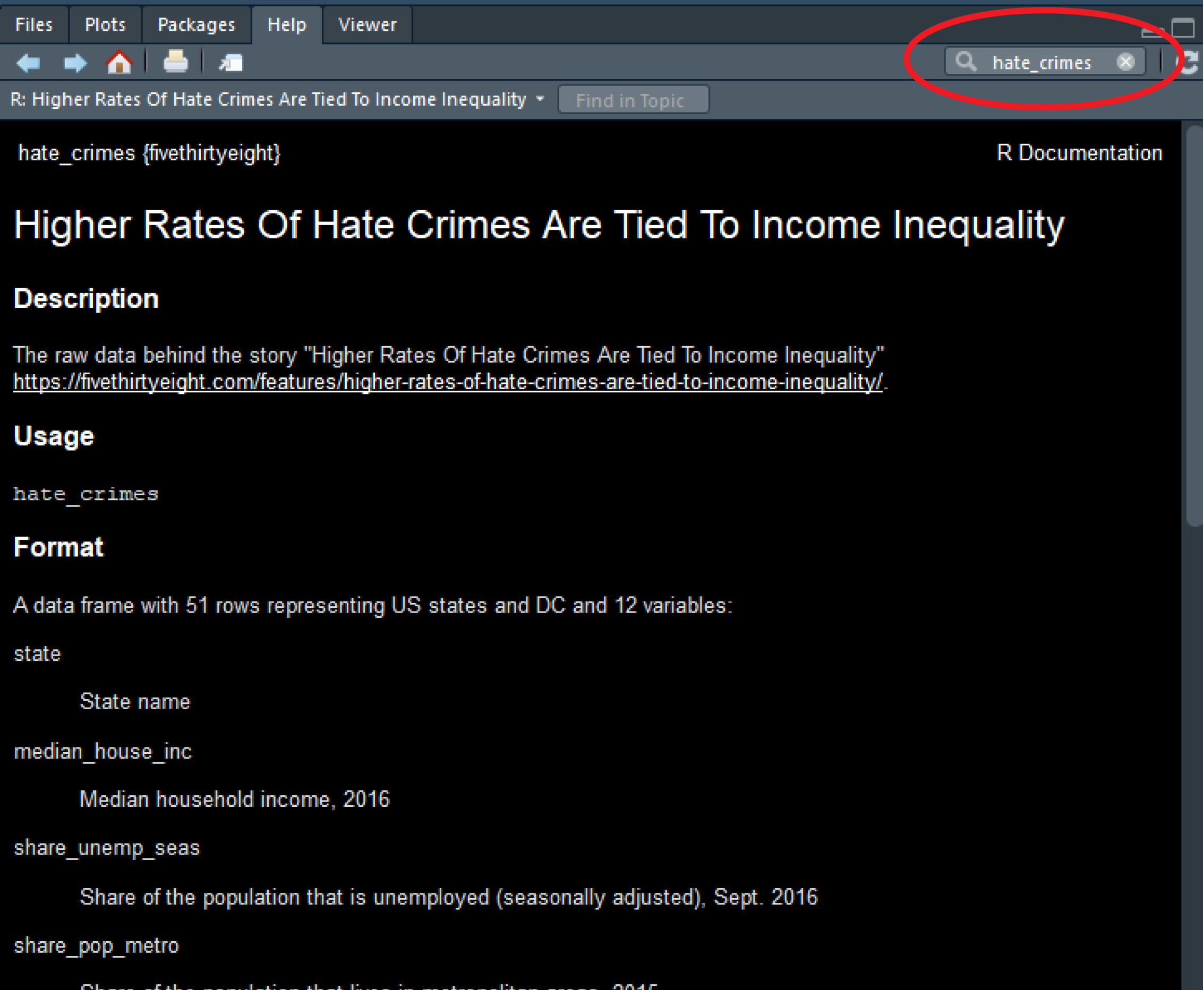 skim(hate_crimes)| skim_type | skim_variable | n_missing | complete_rate | character.min | character.max | character.empty | character.n_unique | character.whitespace | numeric.mean | numeric.sd | numeric.p0 | numeric.p25 | numeric.p50 | numeric.p75 | numeric.p100 | numeric.hist |