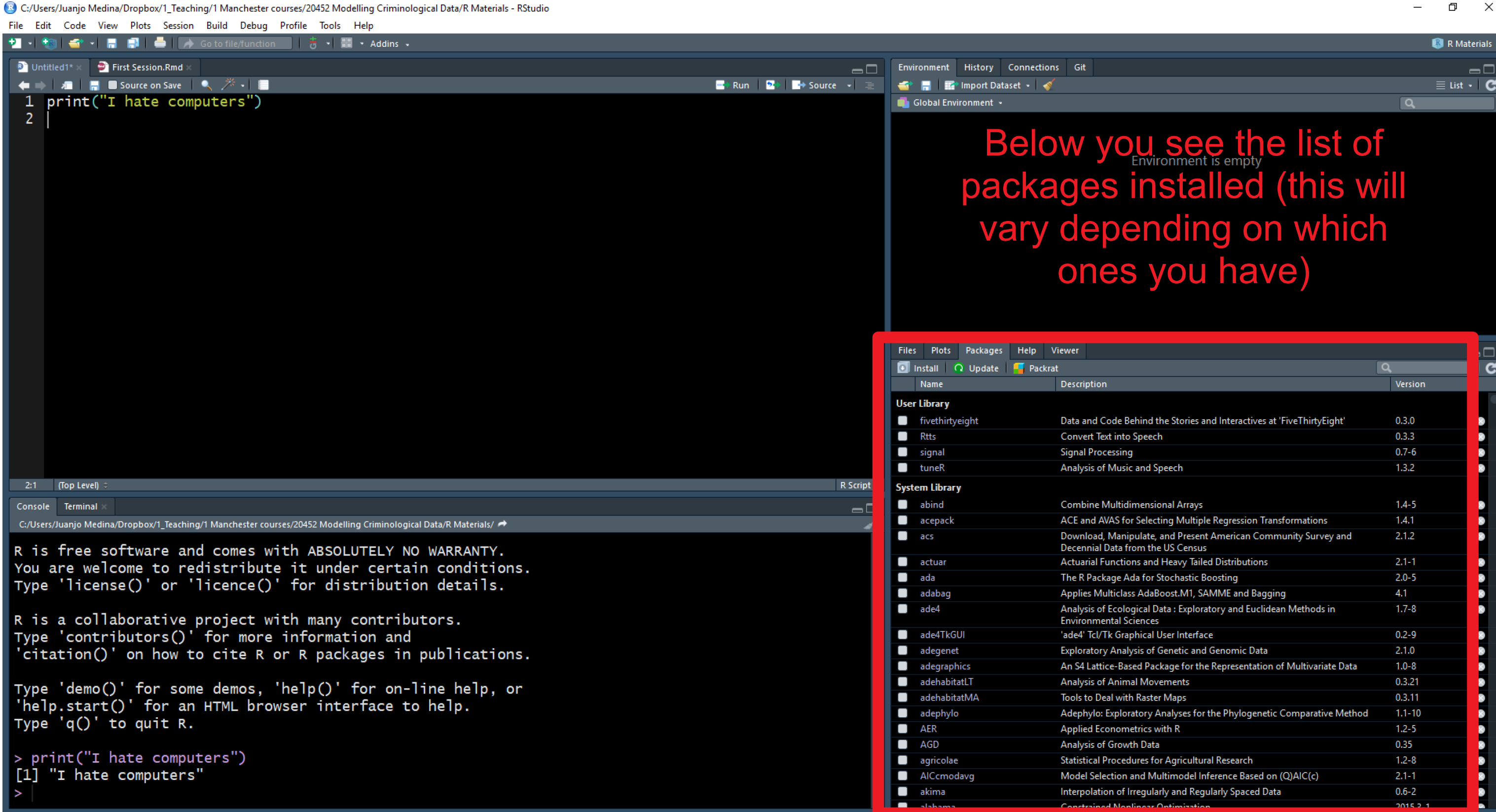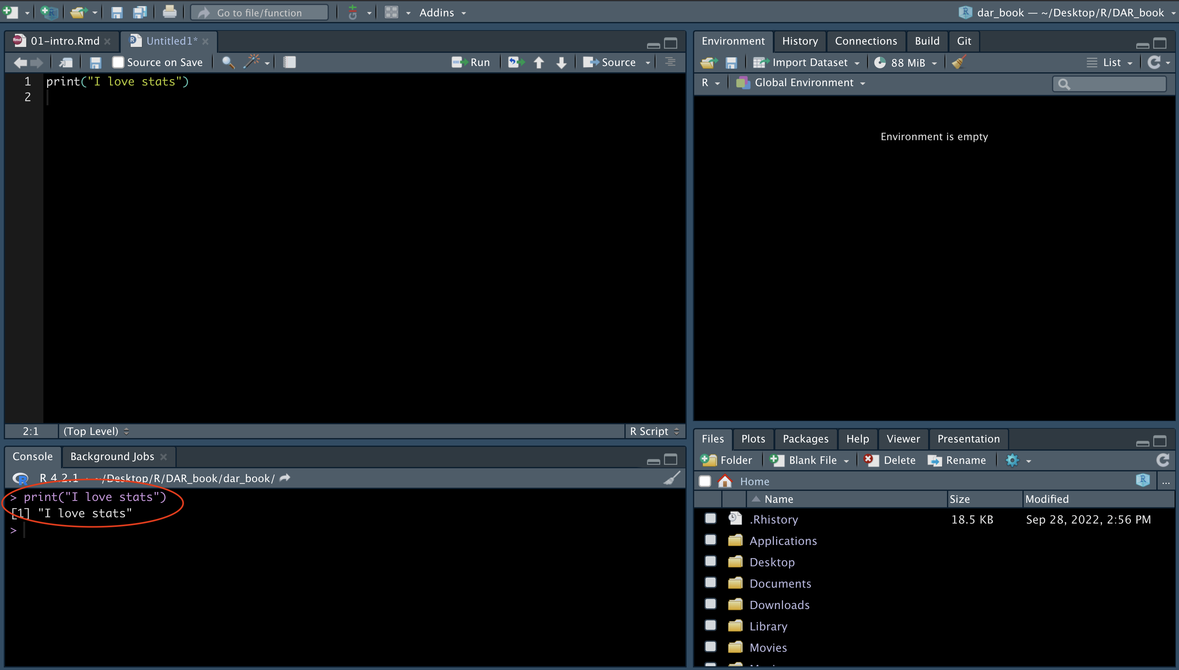 Como se ha indicado anteriormente, la ventana de la esquina inferior izquierda es la consola principal. Si ejecutaste el código anterior, verás que allí aparecen impresas las palabras “Me encanta programar”. Si en lugar de utilizar RStudio estuvieras trabajando directamente desde R, eso es todo lo que obtendrías: la consola principal, donde puedes escribir código de forma interactiva (en lugar de todas las diferentes ventanas que ves en RStudio). Puede escribir tu código directamente en la consola principal y ejecutarlo línea por línea de forma interactiva. Sin embargo, lo recomendable es ejecutar el código desde scripts, para que te acostumbres a la idea de documentar adecuadamente todos los pasos que das.