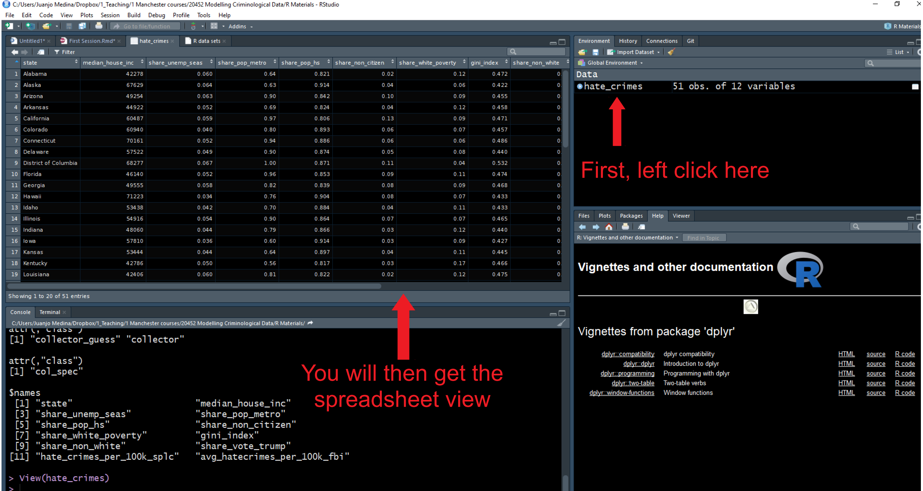 Ahora que hemos cubierto algunos de los aspectos preliminares, podemos pasar a hablar de los datos. En Excel, estás acostumbrado a ver tus datos en formato de hoja de cálculo. Si necesita un resumen, te recomendamos que revises algunos de los materiales diseñados para estudiantes universitarios de Criminología. Este capítulo te ayudará a comprender mejor los conceptos de conjunto de datos, niveles de medición y datos “ordenados”.