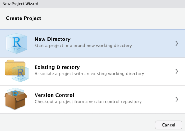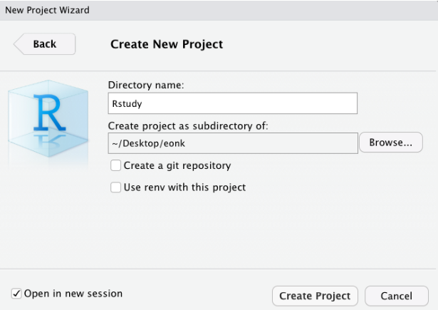 Por último, podrás seleccionar un nombre para tu proyecto (en la imagen siguiente utilizo el nombre “Rstudy”, pero puedes utilizar cualquier nombre sensato que prefieras) y tendrás que especificar la carpeta/directorio en el que colocar este directorio. Selecciona la ubicación que prefieras en tu ordenador portátil (¡preferiblemente, para evitar problemas más adelante no eligas el escritorio!).