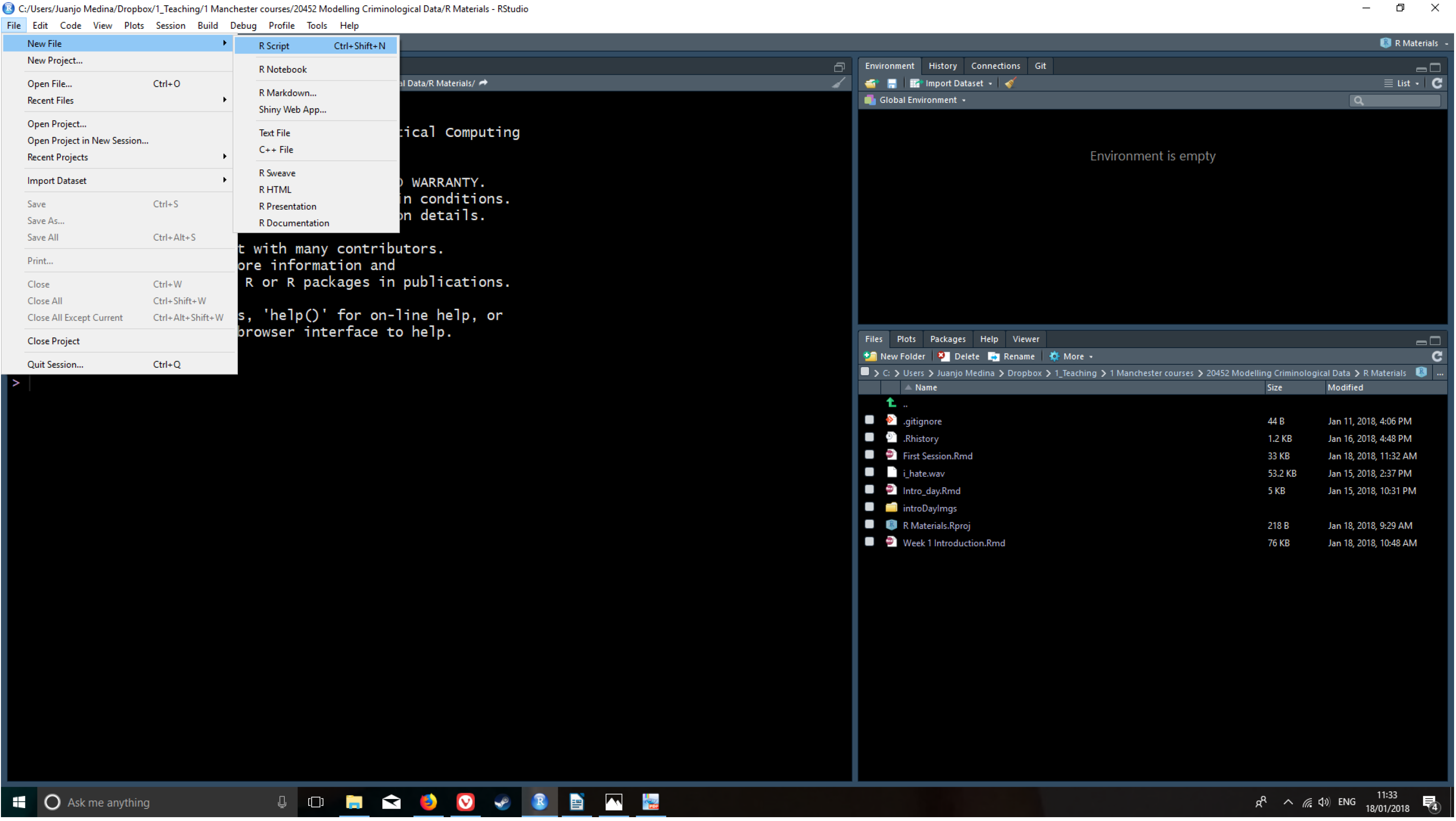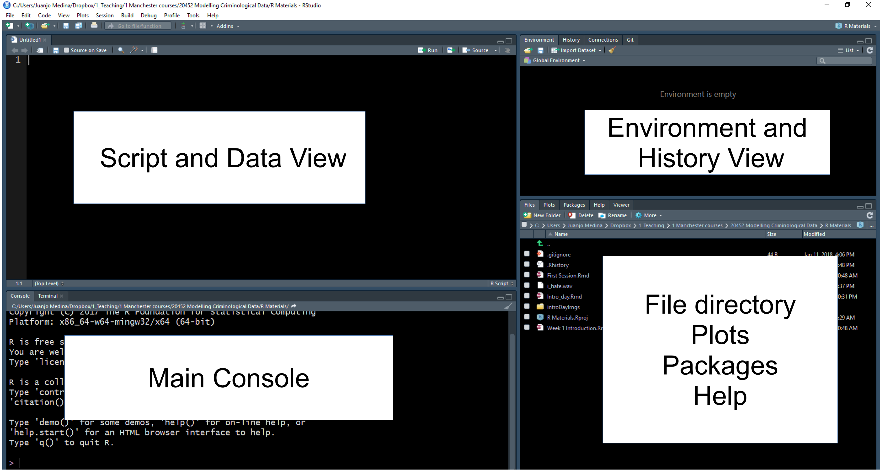 En la esquina diagonalmente opuesta, la superior izquierda, ahora deberías tener una ventana de script abierta. El Script es donde se escribe el código de programación, las instrucciones que se envían al ordenador. Un script no es más que un archivo de texto en el que se puede escribir. A diferencia de otros programas de análisis de datos que hayas utilizado anteriormente (Excel, SPSS), debes interactuar con R escribiendo instrucciones y pidiendo a R que las evalúe. R es un lenguaje de programación interpretado: escribes instrucciones (código) que el motor R tiene que interpretar para hacer algo. Y todas las instrucciones que escribimos pueden y deben guardarse en un script, para que puedas recuperar más tarde lo que hiciste y tu “yo futuro” entienda y recuerde lo que hizo tu “yo pasado”.