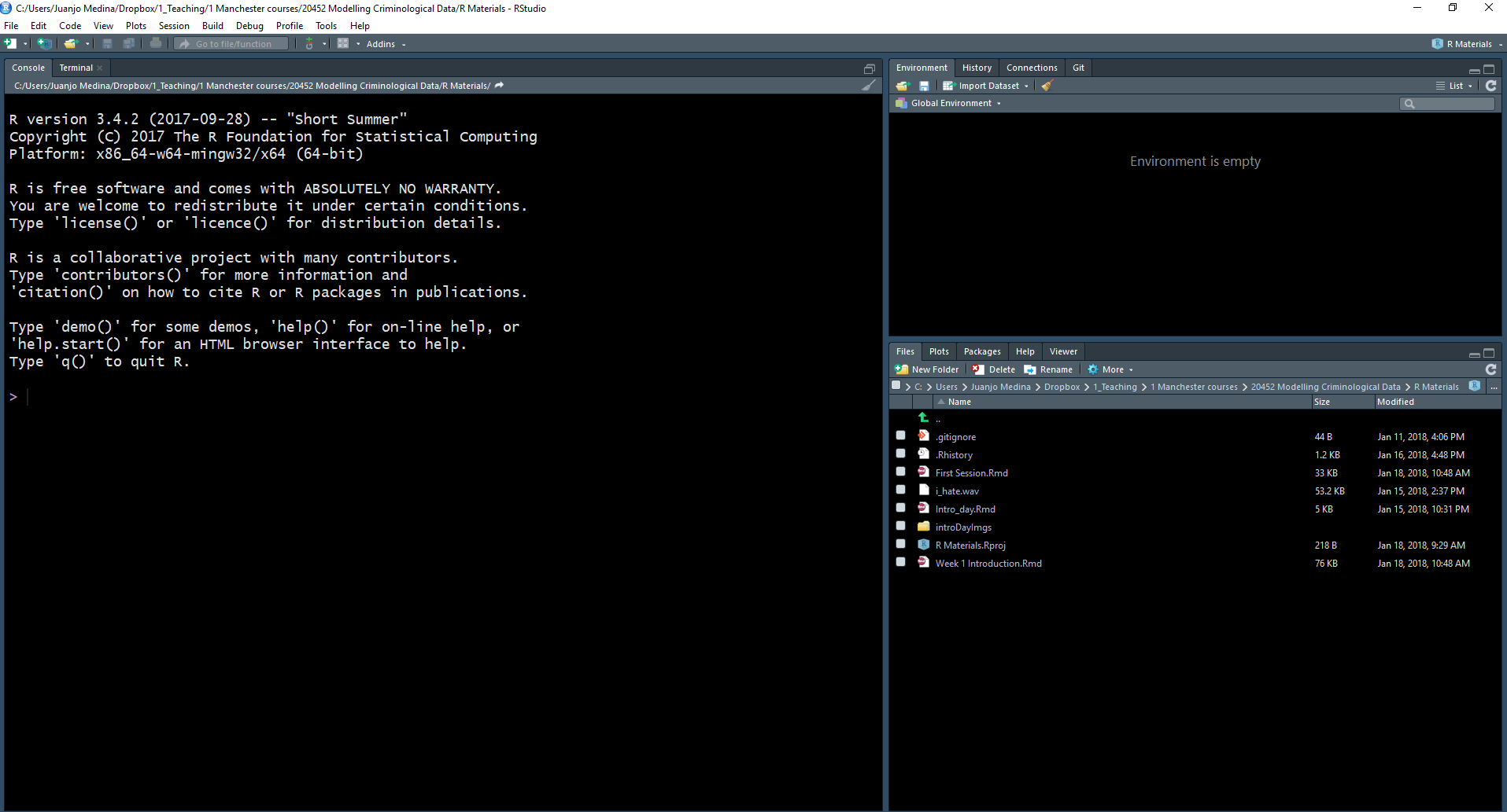 Cuando abras R Studio por primera vez, verás (como en la imagen anterior) que hay tres paneles principales. El más grande, a la izquierda, es la consola. Si lees el texto de la consola, verás que R Studio está abriendo R y podrás ver qué versión de R estás ejecutando. Dependiendo de que máquina estas usando, esto puede variar, pero no te preocupes demasiado por ello.