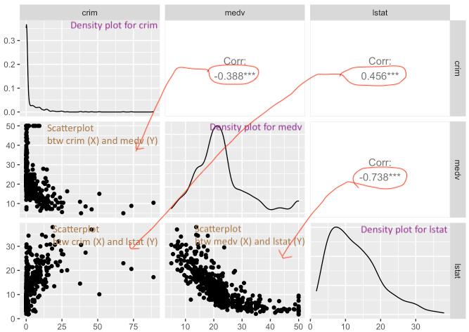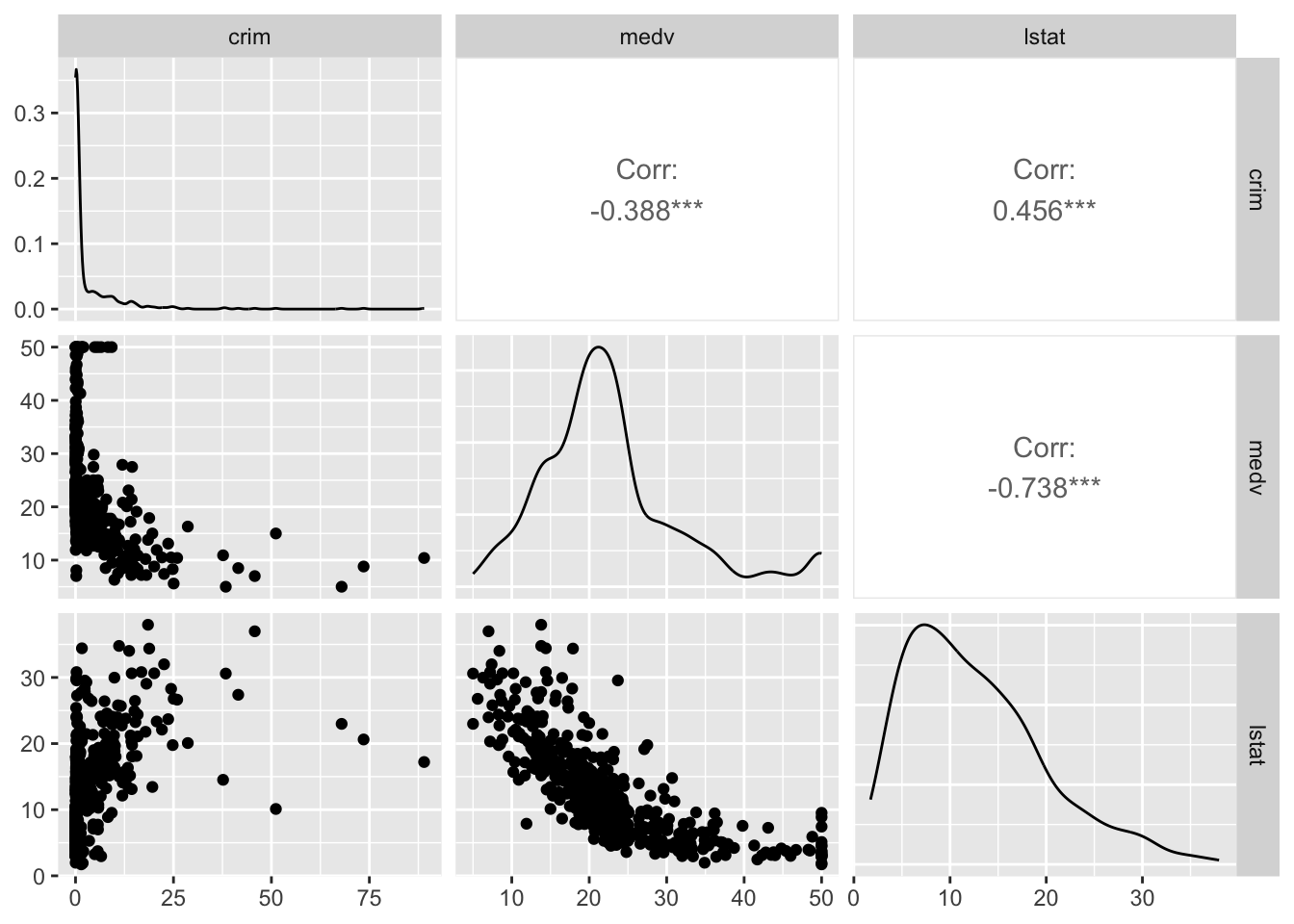 Boston_spm <- dplyr::select(Boston, crim, medv, lstat)A continuación, cargamos ggpairs y ejecutamos la matriz de diagramas de dispersión utilizando la función ggpairs: