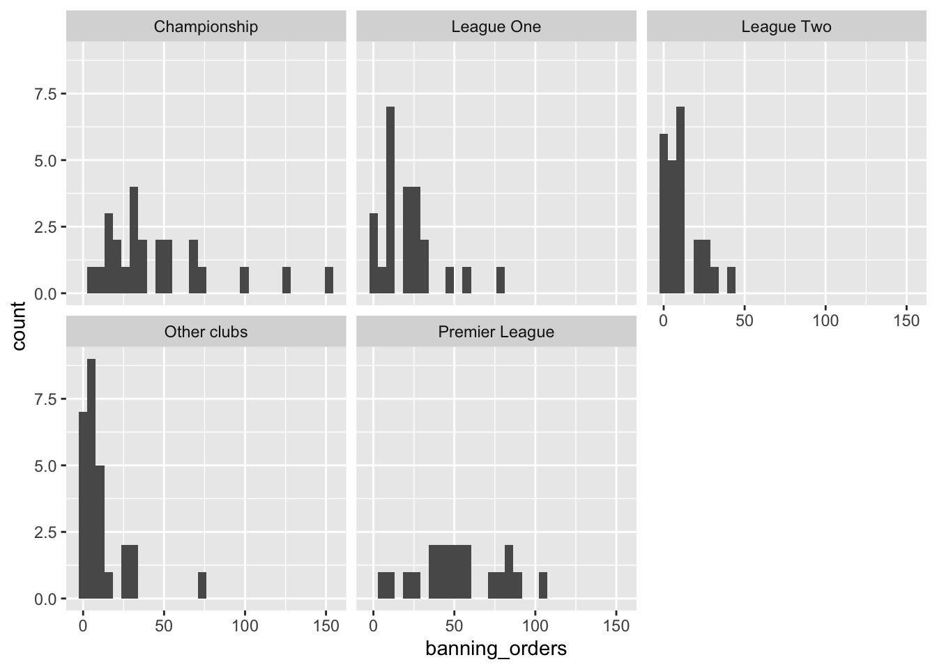 Una consideración importante es que el gráfico que utilice depende de los datos que esté representando, así como del mensaje que desee transmitir con el gráfico, el público al que va dirigido e incluso el formato en el que se presentará (un sitio web, un informe impreso, una presentación de PowerPoint, etc.). Así, por ejemplo, volviendo de nuevo a la diferencia entre el número de órdenes de prohibición entre clubes de diferentes ligas, ¿cuáles son algunas formas de representar estos datos?