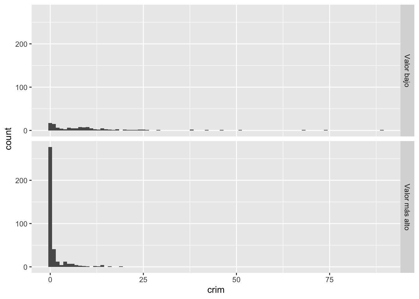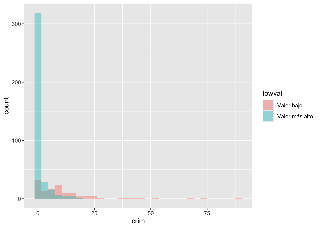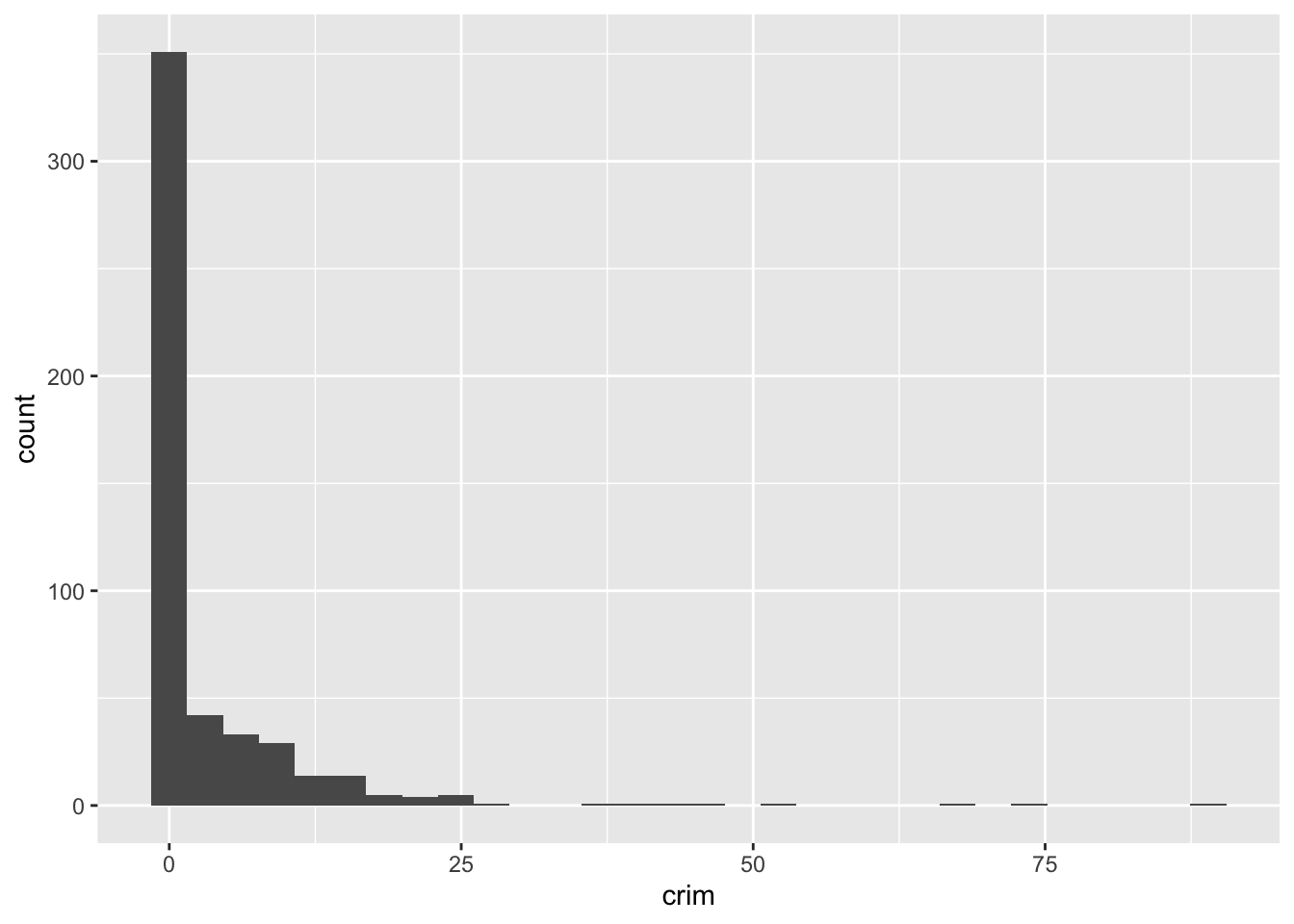 Como puedes ver, ggplot funciona de tal manera que puedes añadir una serie de especificaciones adicionales (capas, anotaciones). En este sencillo gráfico, la función ggplot simplemente asigna crim como la variable que se va a mostrar (como uno de los elementos estéticos) y el conjunto de datos. A continuación, se añade geom_histogram para indicar a R que se desea que esta variable se represente como un histograma. Más adelante veremos qué otras cosas se pueden añadir.