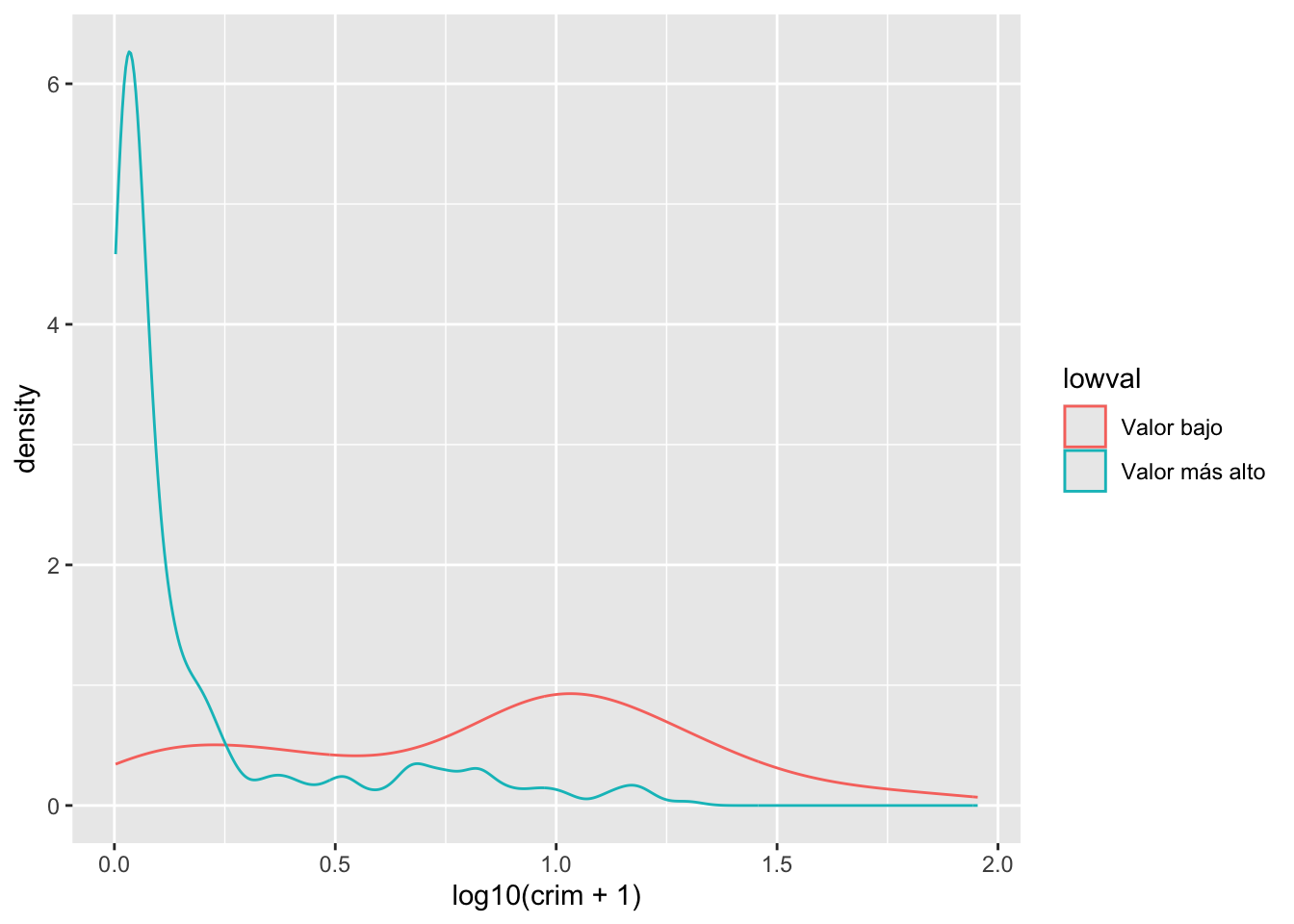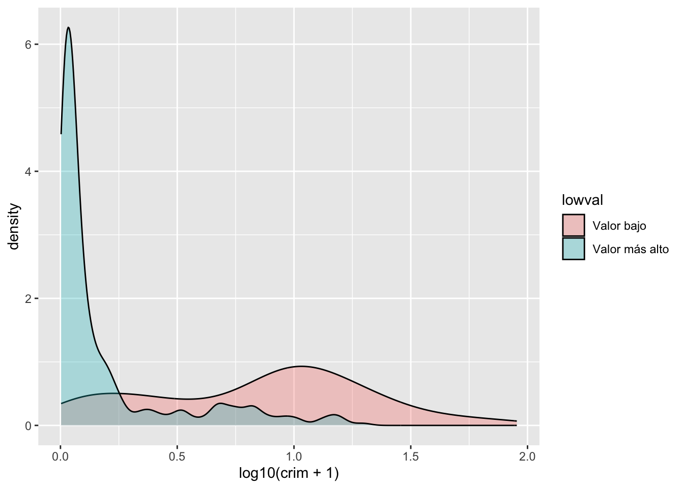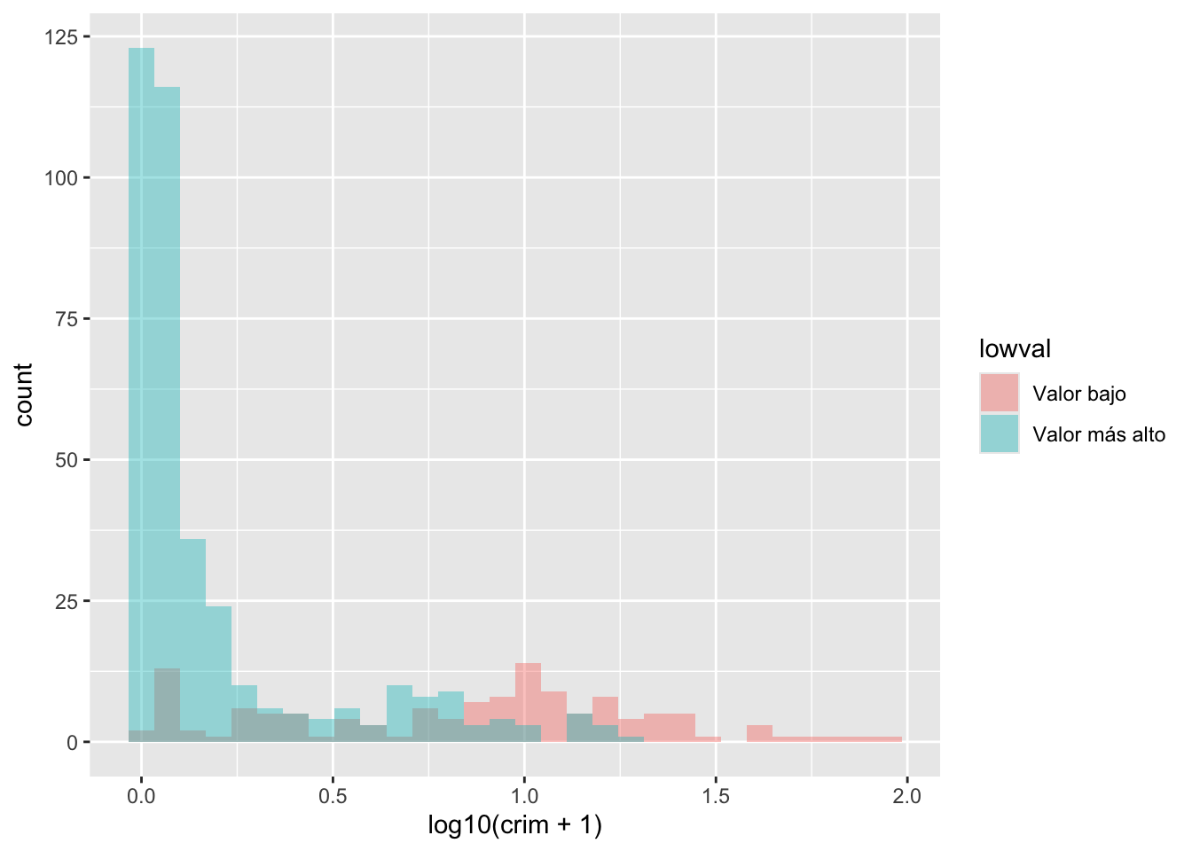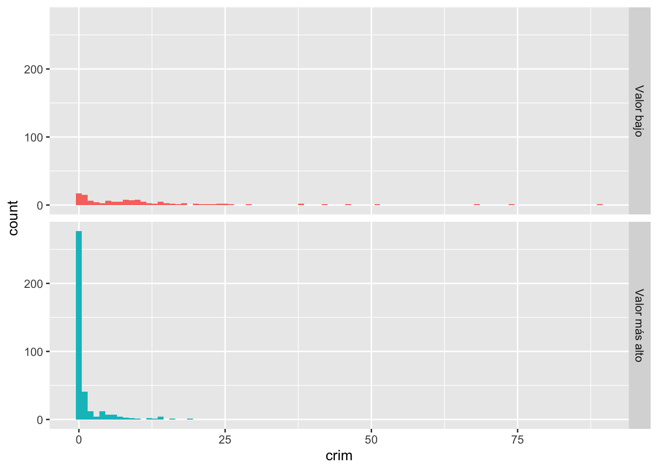 Como puedes ver, ggplot funciona de tal manera que puedes añadir una serie de especificaciones adicionales (capas, anotaciones). En este sencillo gráfico, la función ggplot simplemente asigna crim como la variable que se va a mostrar (como uno de los elementos estéticos) y el conjunto de datos. A continuación, se añade geom_histogram para indicar a R que se desea que esta variable se represente como un histograma. Más adelante veremos qué otras cosas se pueden añadir.