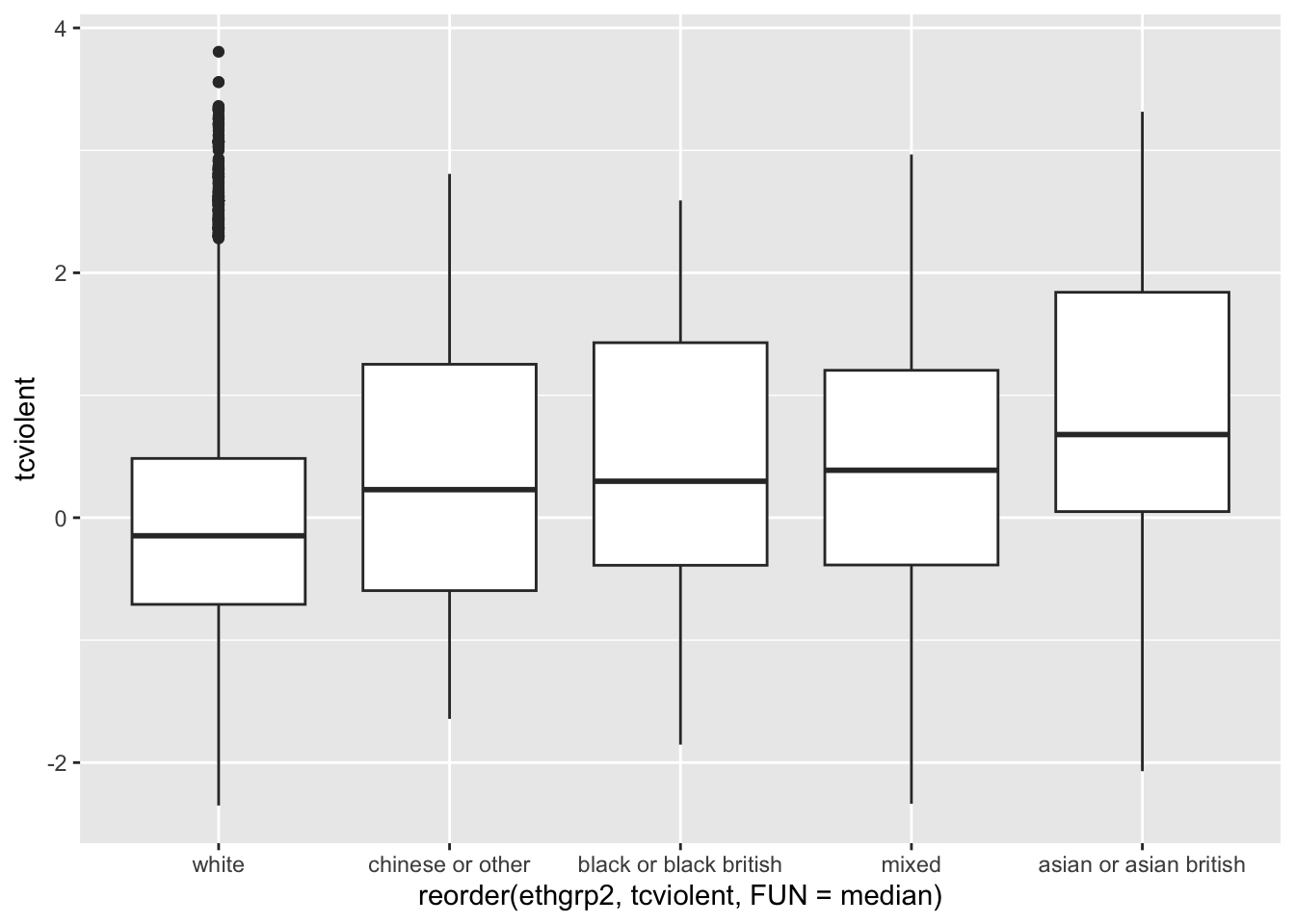 Desafortunadamente, los niveles de este factor están ordenados alfabéticamente, lo que resulta confuso. Podemos modificar esto reordenando primero los niveles de los factores. Haga clic aquí para obtener más detalles. Podría hacerlo dentro de la función ggplot (solo para la visualización), pero en la vida real, lo ideal sería ordenar los niveles de los factores de forma más permanente. Como se comentó la semana pasada, esto es algo que se hace como parte del preprocesamiento de los datos. Y luego se traza el gráfico.
