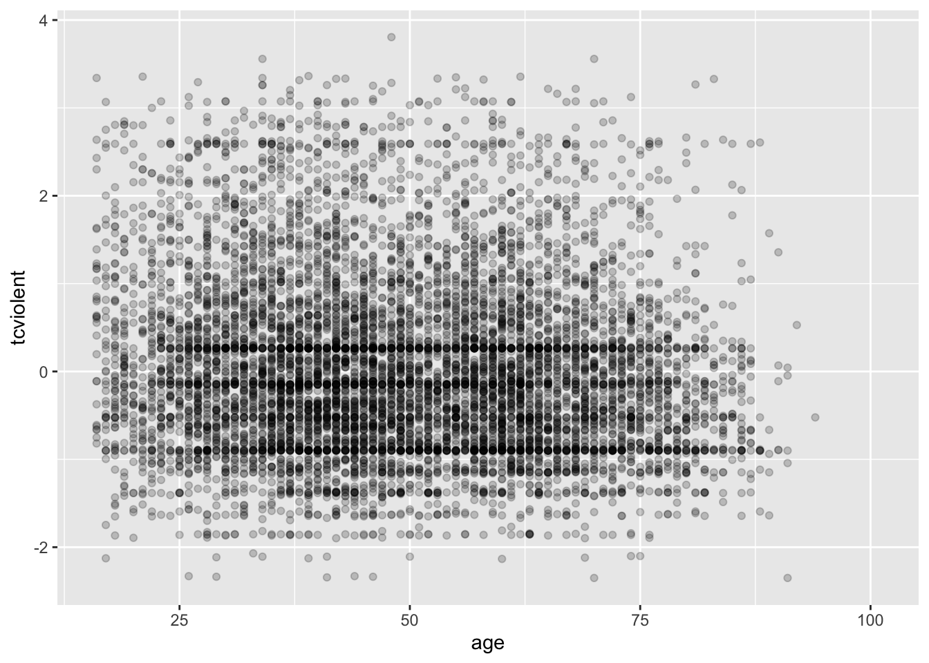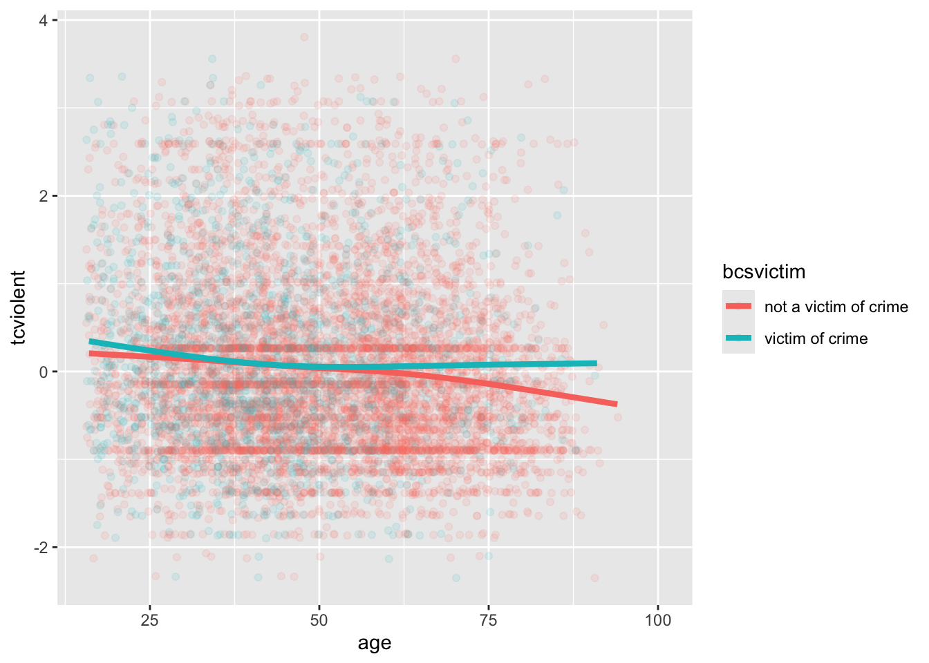 ggplot(BCS0708, aes(x = age, y = tcviolent, colour = bcsvictim)) +