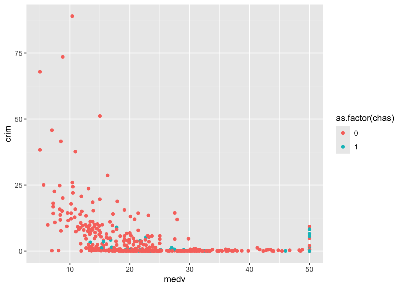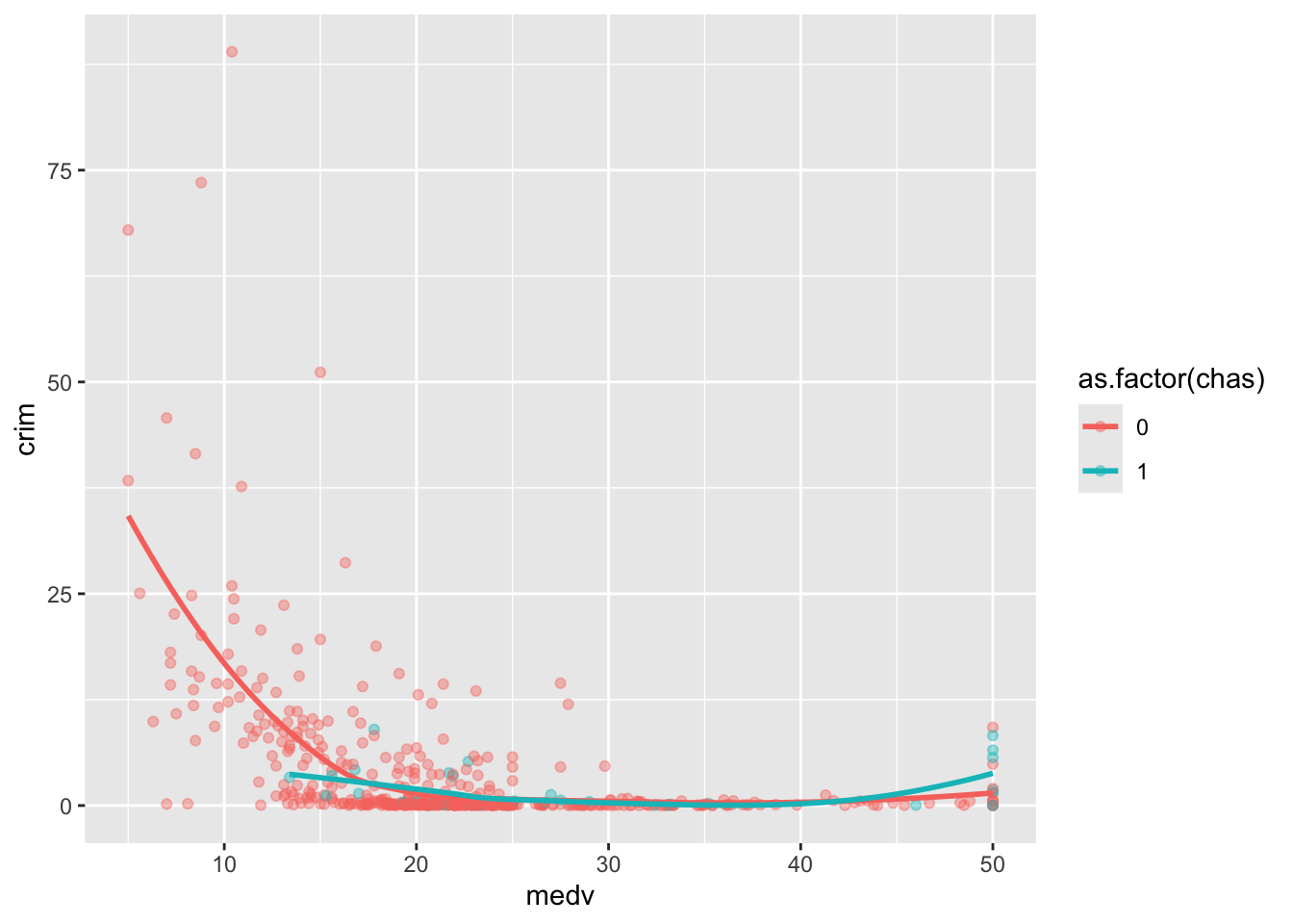 #Observe cómo aquí estamos utilizando una función adicional para pedir a R que trate la variable chas, que es numérica en nuestro conjunto de datos, como si fuera un factor (as.factor()). Debe hacer esto si su variable es categórica pero está codificada como numérica en su marco de datos.