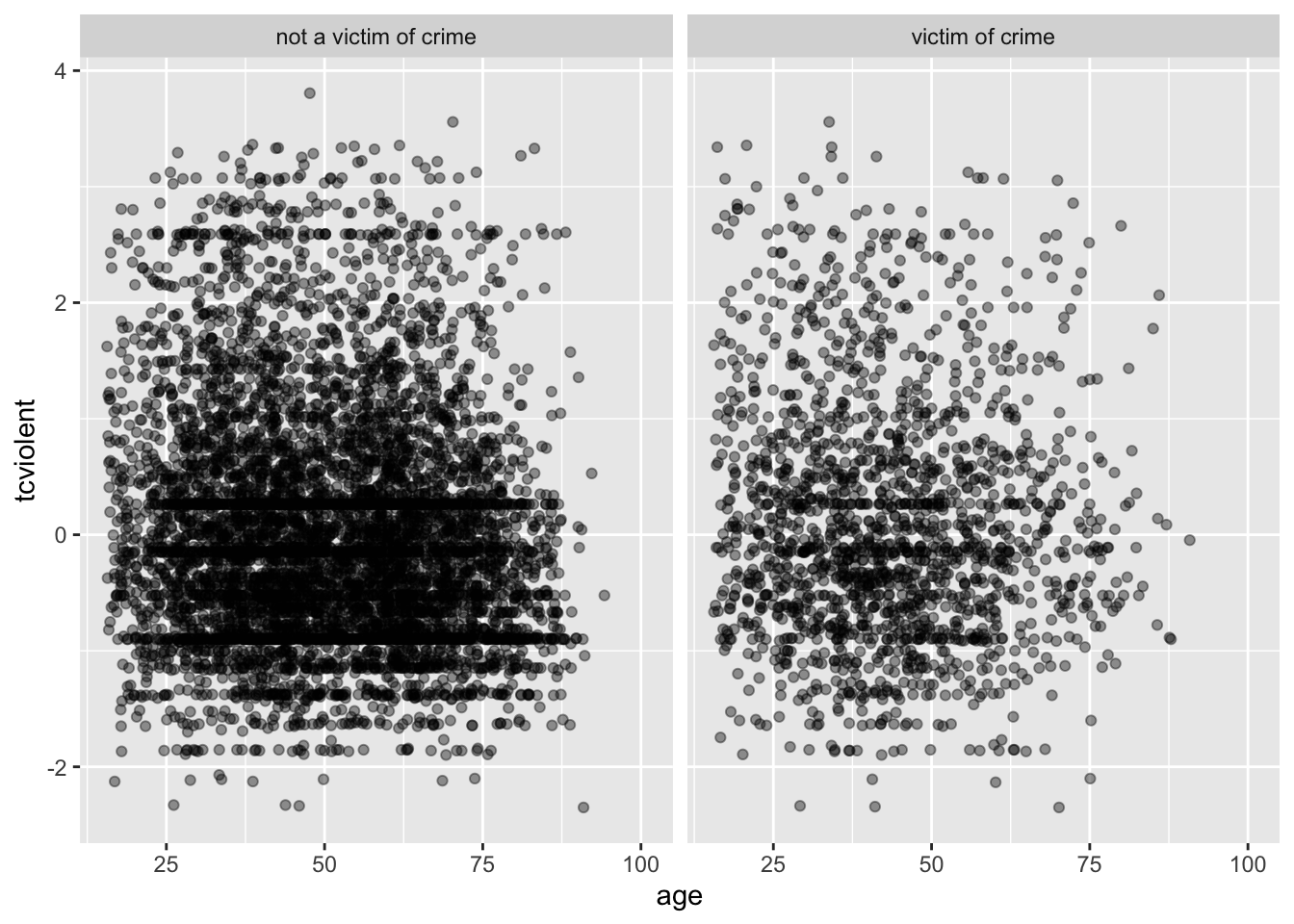 Es posible que notes que hay más puntos verdes en el lado izquierdo (ya que la victimización tiende a ser más común entre los jóvenes). Pero es difícil interpretar la relación con la edad. ¿Podríamos intentar utilizar facetas en lugar de facet_grid?