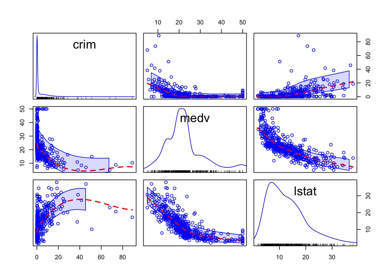 Esto es un poco diferente de lo anterior porque, en lugar de mostrar los valores del coeficiente de correlación, lo que se obtiene es otro conjunto de diagramas de dispersión, pero con los ejes Y y X girados. Se puede ver que la matriz es simétrica. Así, el primer diagrama de dispersión que se ve en la fila superior (segunda columna desde la izquierda) muestra la relación entre medv (en el eje X) y crim (en el eje Y). Es la misma relación que se muestra en el primer diagrama de dispersión de la segunda fila (primera columna), solo que aquí crim define el eje X y medv el eje Y. En este diagrama de dispersión se puede ver, aunque no muy bien, que se han añadido líneas suavizadas que representan la relación.