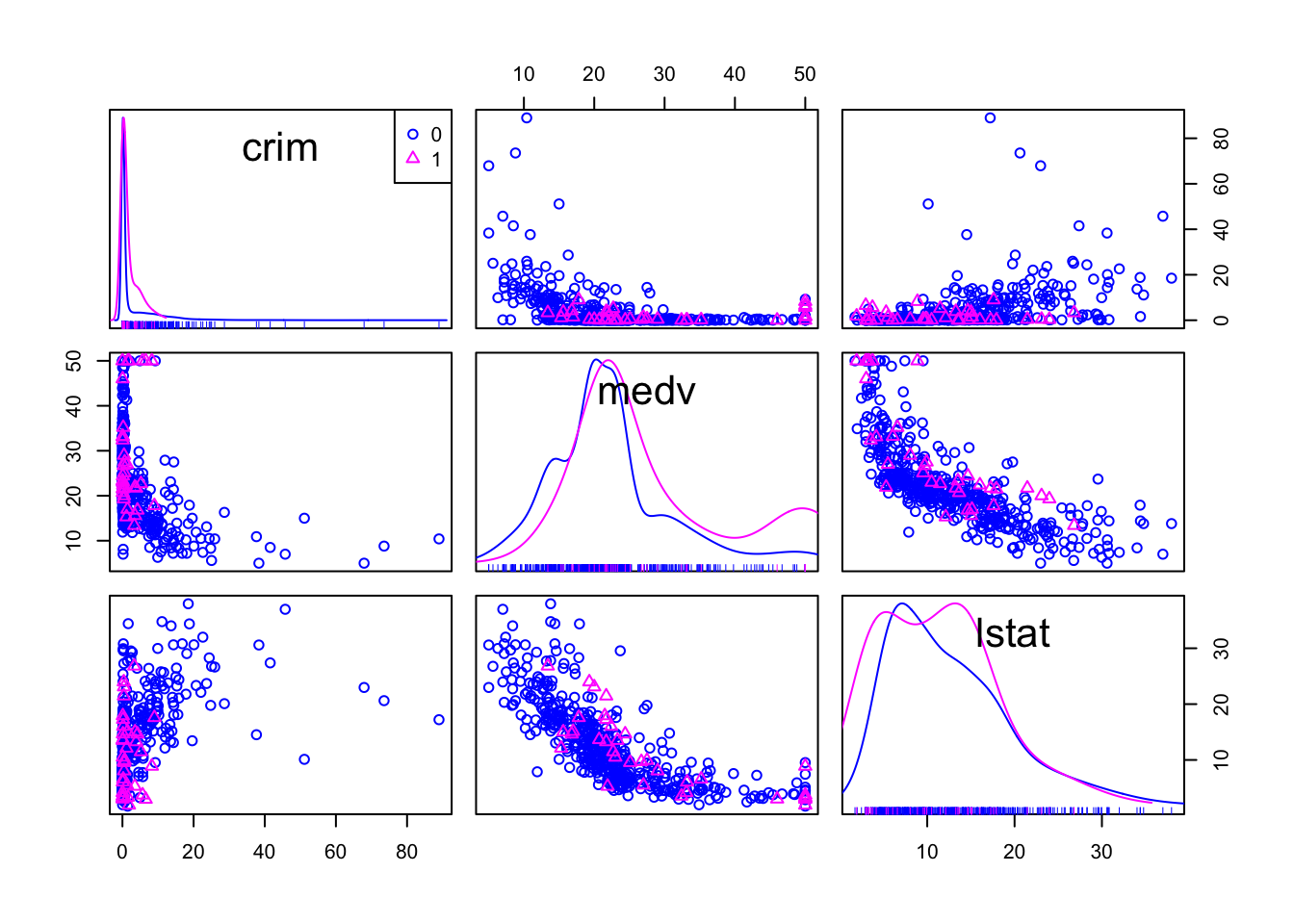 spm(~crim+medv+lstat, data=Boston_spm, groups=Boston_spm$chas, by.groups=TRUE, smooth=FALSE, regLine=FALSE)