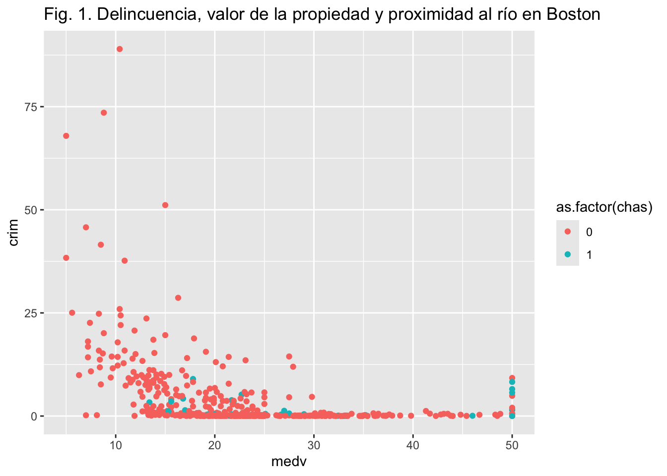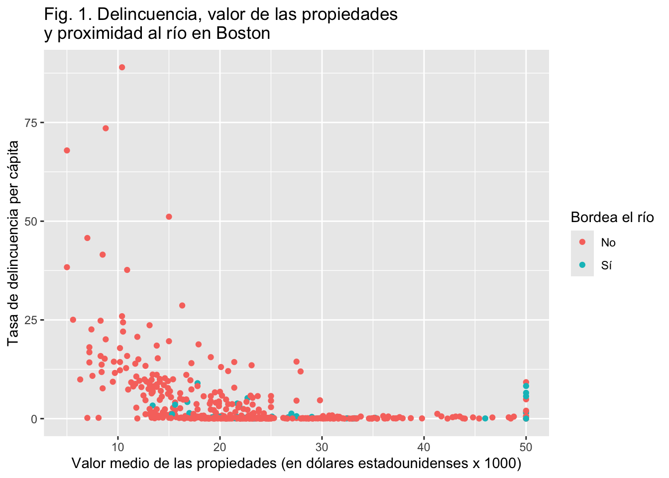 ggtitle("Fig. 1. Delincuencia, valor de la propiedad y proximidad al río en Boston")
