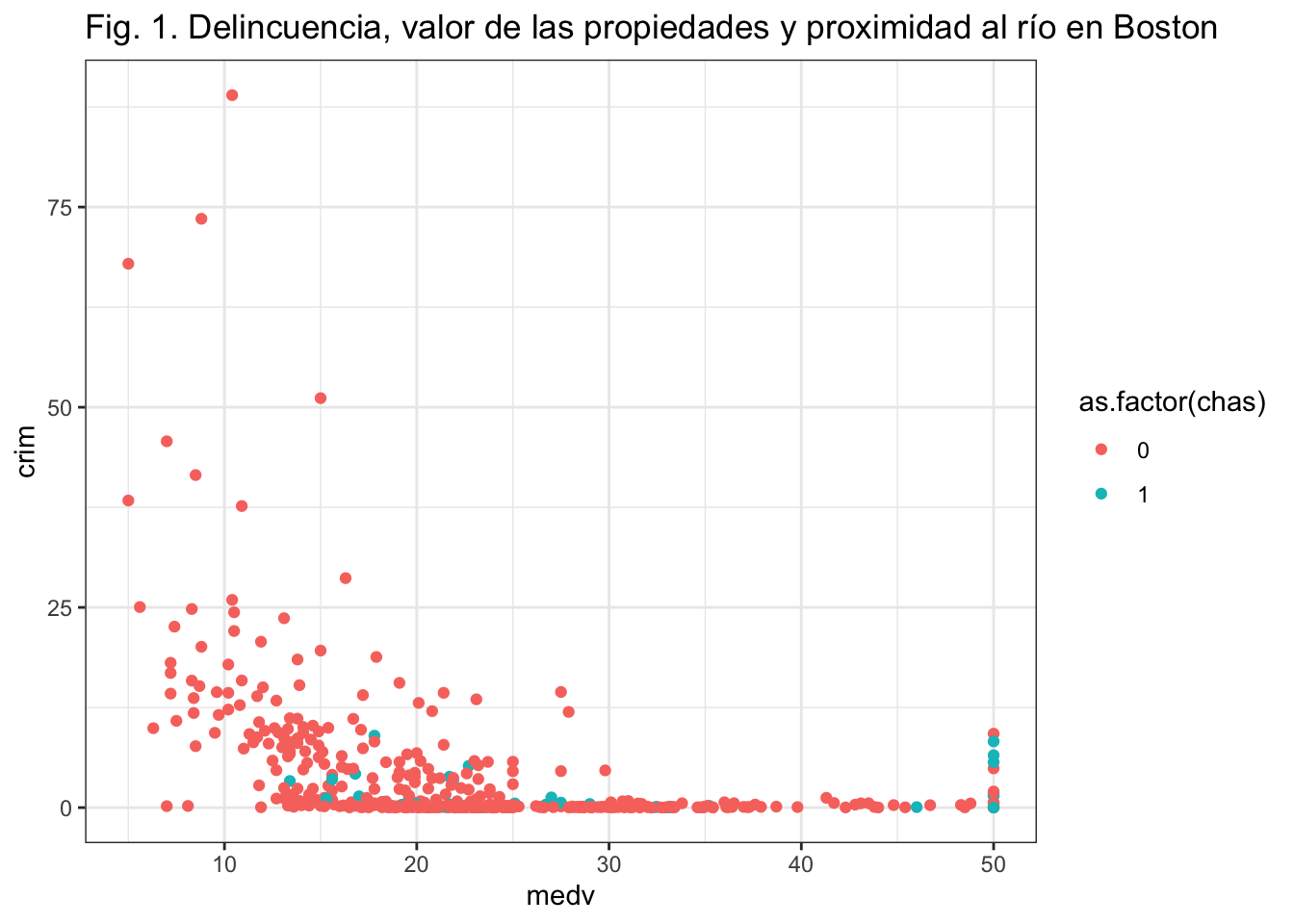 ggtitle("Fig. 1. Delincuencia, valor de las propiedades y proximidad al río en Boston") +