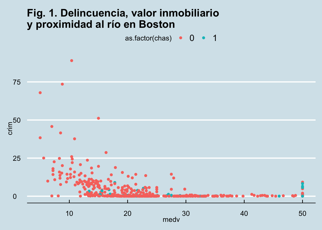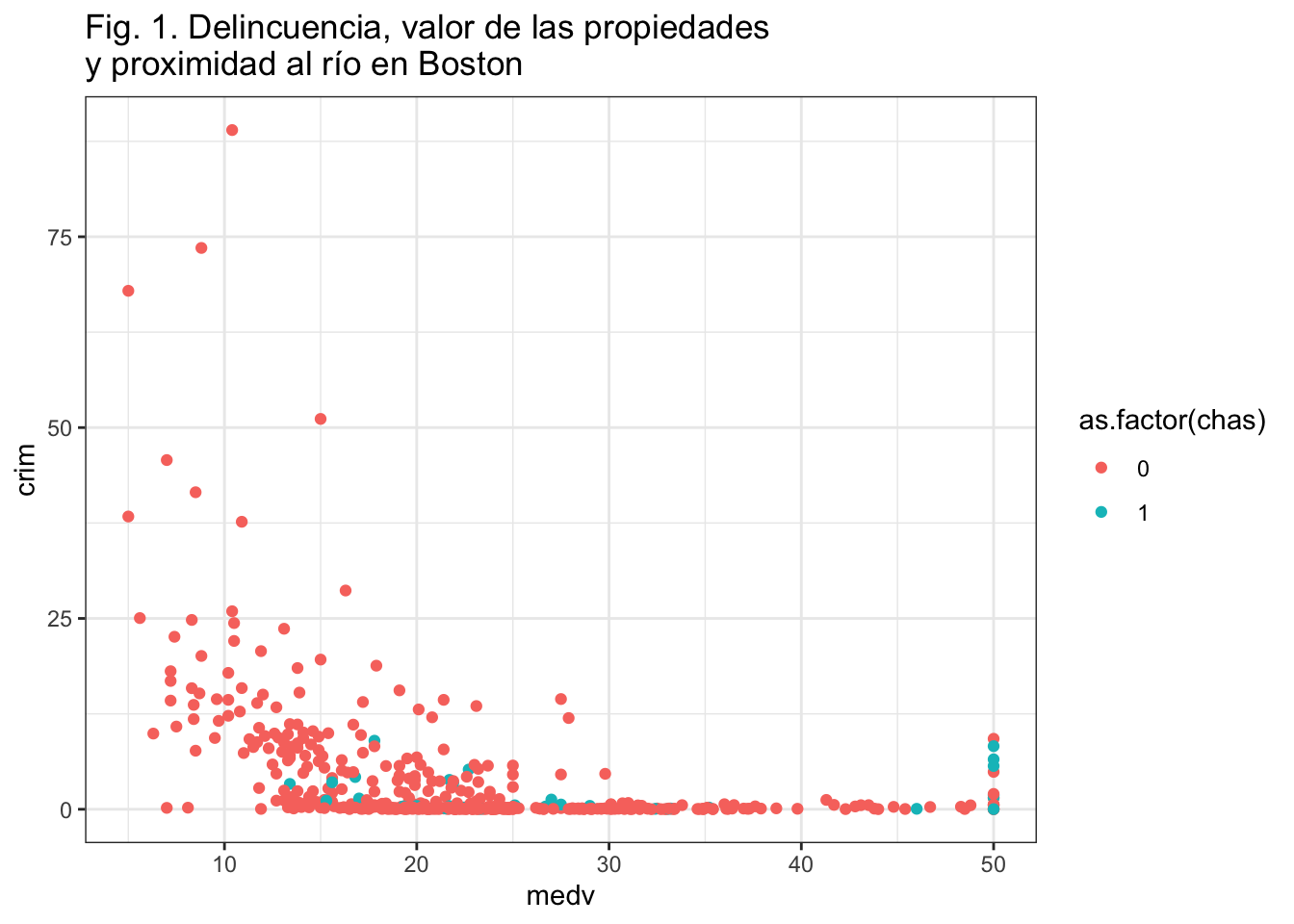 ggtitle("Fig. 1. Delincuencia, valor de las propiedades\ny proximidad al río en Boston") +