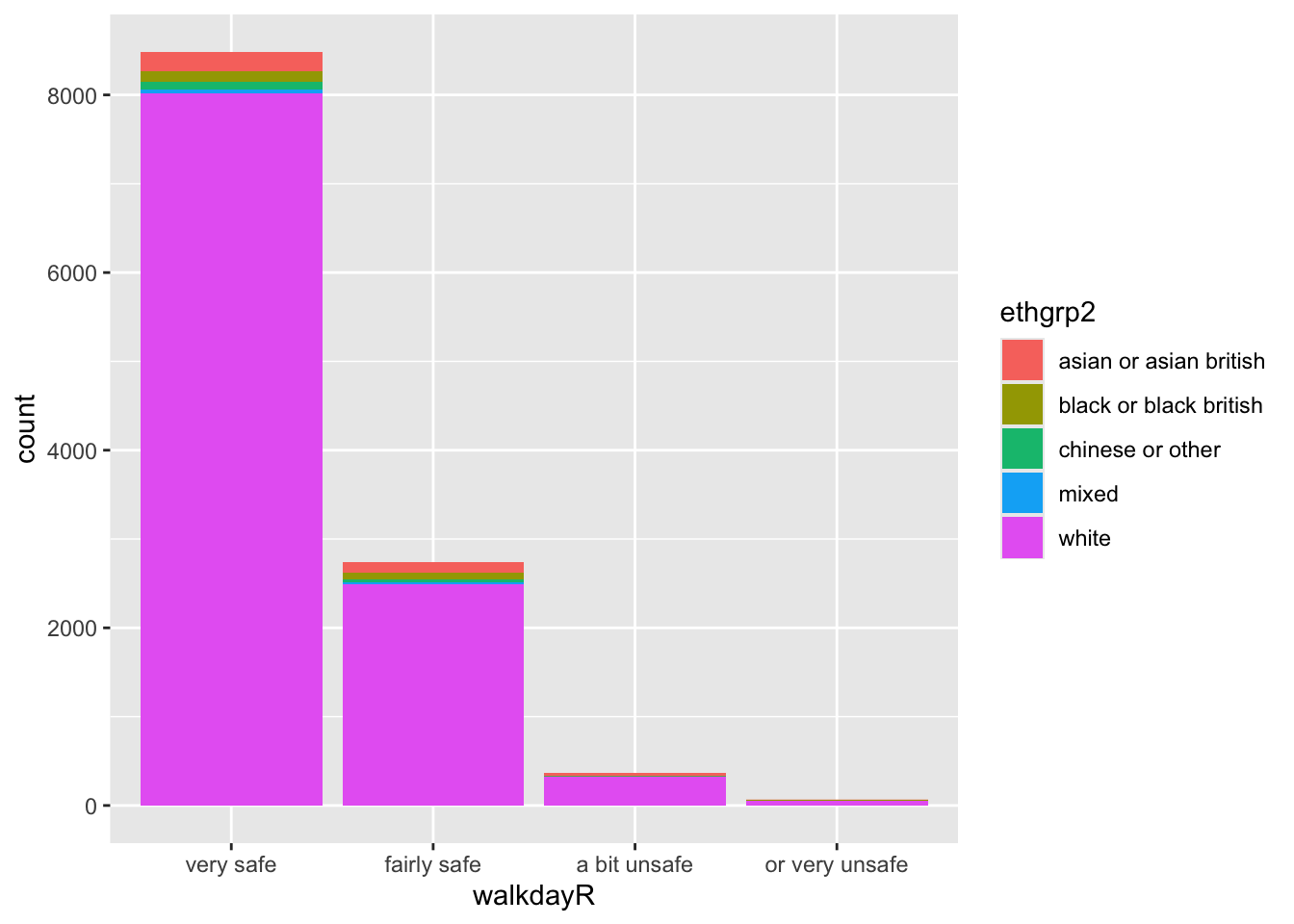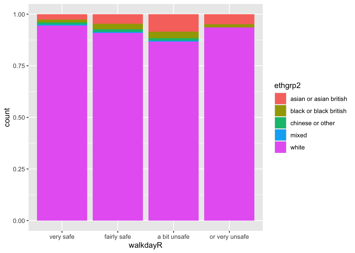También podemos asignar una segunda variable a la estética. Por ejemplo, veamos la etnia en relación con la sensación de seguridad. Para ello, creamos un gráfico de barras apiladas.