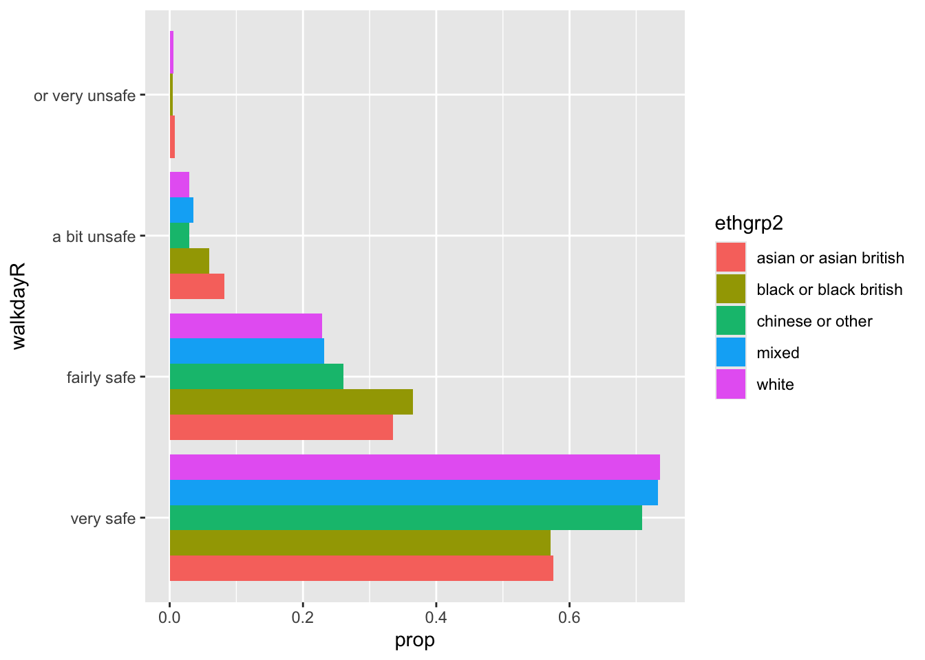 En cambio, lo que quieres es un tipo diferente de gráfico de barras apiladas, que te dé la proporción de tu “variable explicativa” (etnia) dentro de cada uno de los niveles de tu “variable de respuesta” (en este caso, la sensación de seguridad).